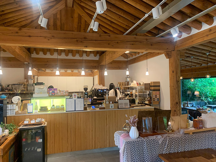 목조건물이고 천장이 아주 높아서 쾌적하고 좋았습니다. 시끌벅적한 그런 카페는 아니고 정말 아늑하고 조용해서 고요함마저 드는 곳이고 사방이 숲으로 둘러싸여 있어서 정말 창가를 바라보면 파릇파릇하니 좋아요. 테이블의 의자들도 여러 가지 스타일의 편안한 의자가 있어서 한적하게 차 마시면서 휴식을 취하기도 좋습니다.