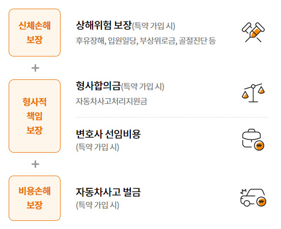 | 자동차사고처리지원금Ⅹ | 자동차 운전 중 사고로 타인(피보험자의 부모, 배우자 및 자녀 제외)을 사망케하거나 아래와 같은 상해를 입힌 경우 • '중대법규 위반교통사고'로 42일 이상 진단받은 경우 • 자동차 운전중'일반교통사고'로 피해자에게 중상해를 입히거나 자동차손해배상보장법 시행령 제3조에서 정한 상해1-3급에 해당하는 부상을 입한 경우 |